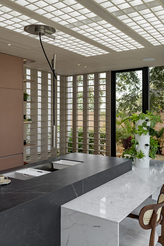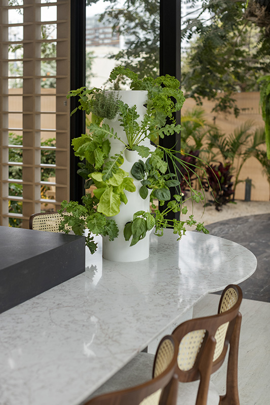 Sobre ella, un jardín comestible vertical crece como una escultura viva, cultivando no solo hierbas, sino también una nueva manera de habitar: más consciente, más sensorial, más generosa.
