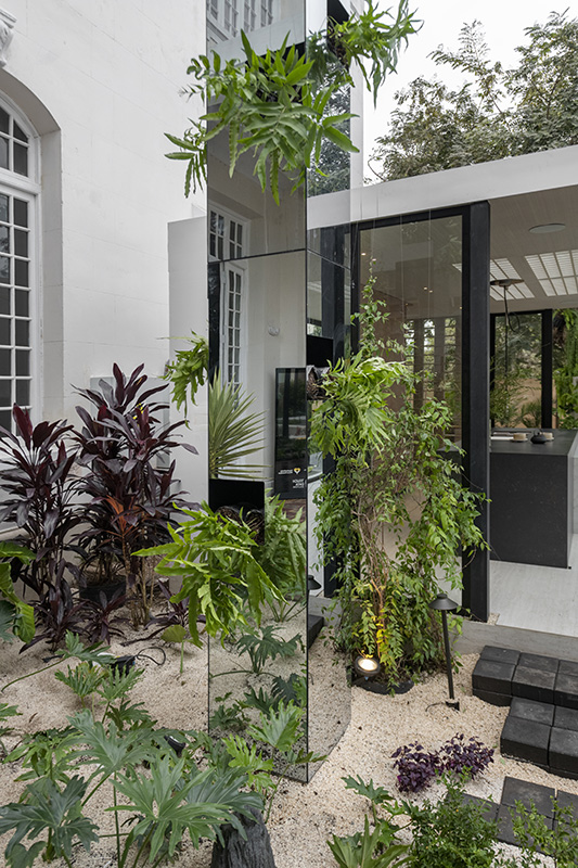 El paisajismo de Marcia Lenz dialoga con respeto y libertad: los espejos multiplican la vegetación, borrando los límites del espacio, mientras texturas minerales y maderas nobles se integran con plantas tropicales, como si siempre hubiesen estado allí.
