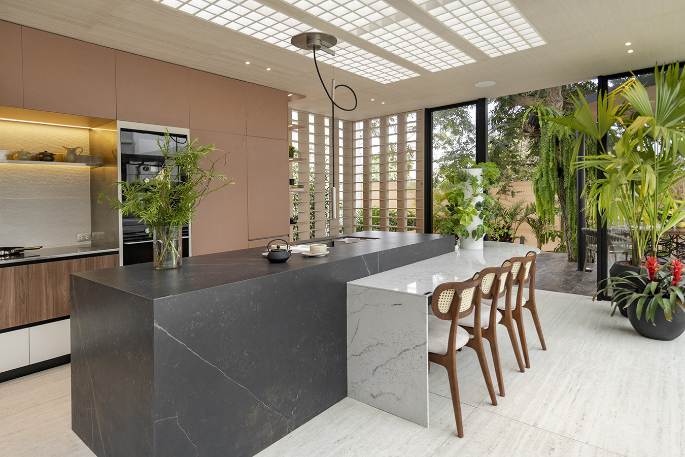 En este proyecto, la arquitectura se vuelve porosa, el interior se disuelve hacia el paisaje, y la cocina —corazón del hogar— se transforma en un umbral entre lo íntimo y lo abierto.